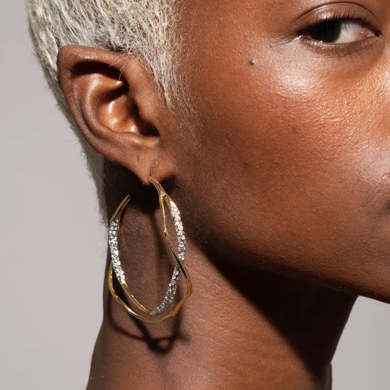The Lyss Earrings are crafted for the woman who loves subtle luxury and effortless sophistication. Featuring a sculpted, twisted gold silhouette intertwined with a row of shimmering pave stones, these earrings create a soft, radiant sparkle that instantly elevates any look.